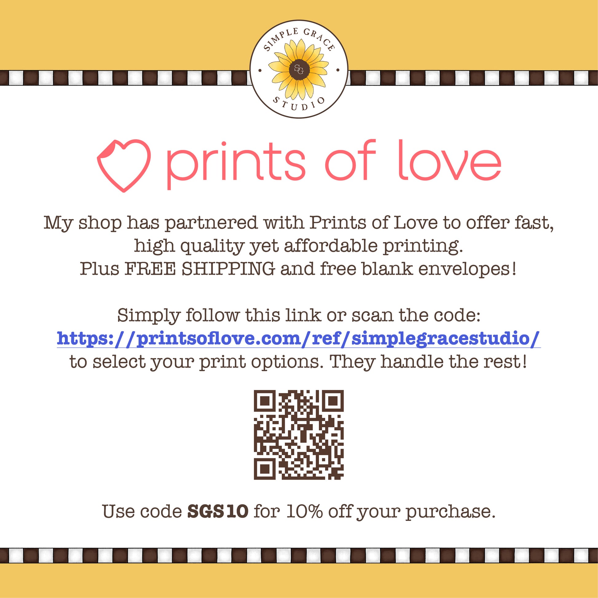 Digital files for you to print at home, or a professional printer. If you’re considering a professional printer, I recommend Prints of Love. My shop has partnered with them to offer fast, high quality yet affordable printing. Plus FREE U.S. shipping and free envelopes! Check them out at: https://printsoflove.com/simplegracestudio/