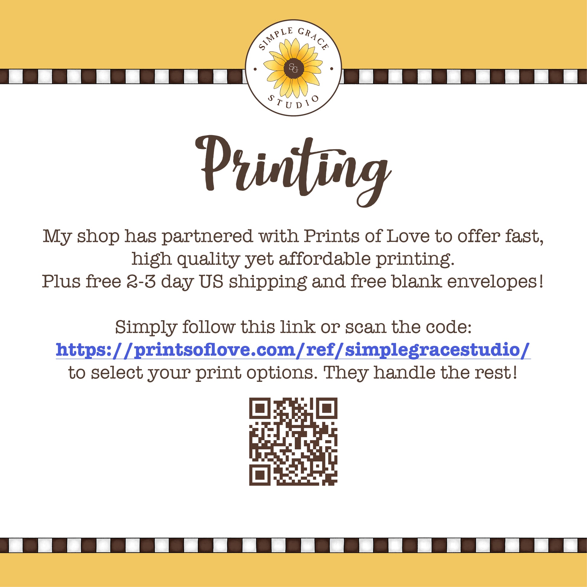 Digital files for you to print at home, or a professional printer. If you’re considering a professional printer, I recommend Prints of Love. My shop has partnered with them to offer fast, high quality yet affordable printing. Plus free 2-3 day U.S. shipping and free envelopes! Check them out at: https://printsoflove.com/simplegracestudio/